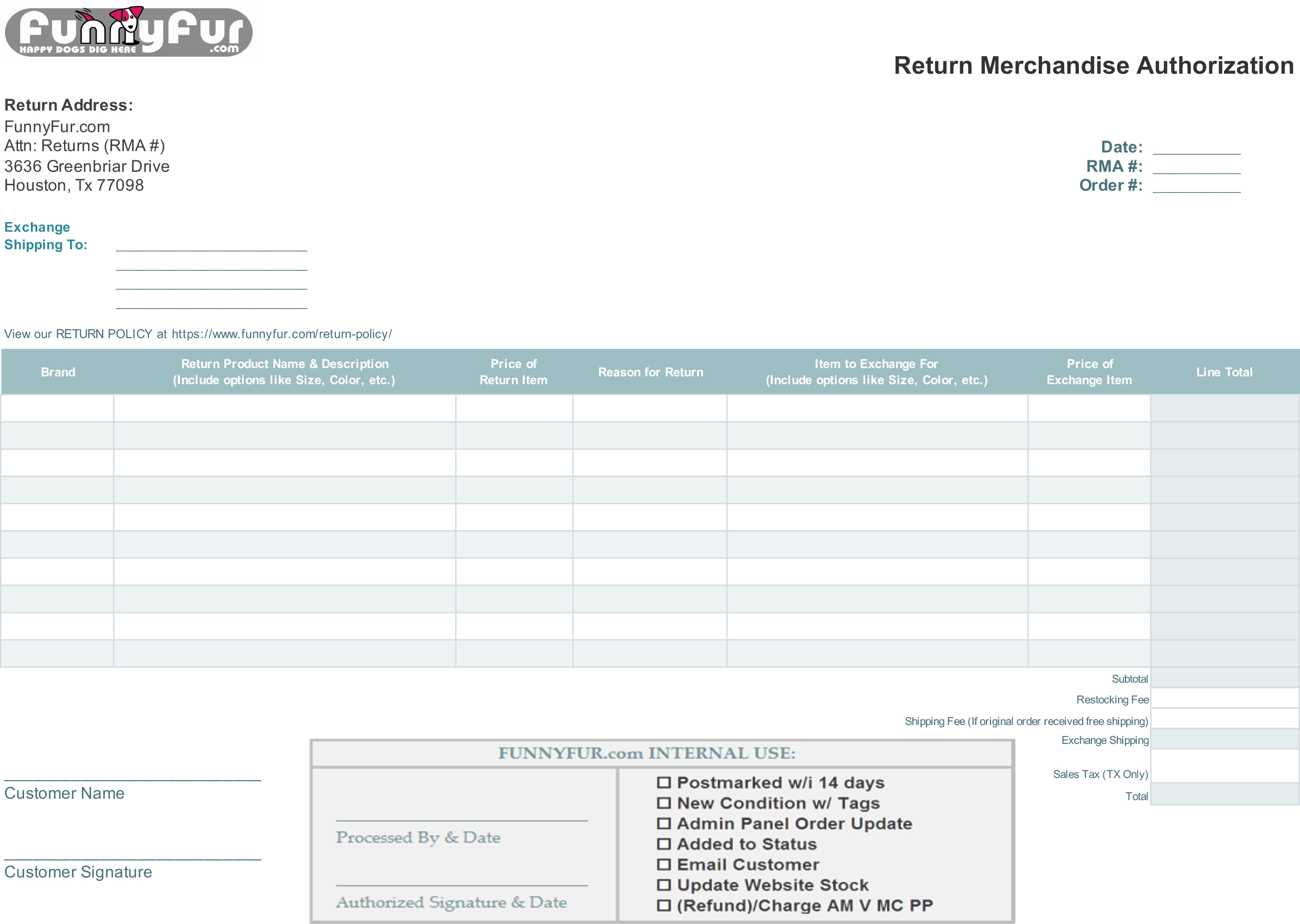 Please email us at returns@funnyfur.com with your Invoice Order # and the item(s) you wish to return. We will provide you with a Return Merchandise Authorization (RMA) number for each return within 1-2 business days of request. A valid RMA number must be clearly labeled on your return package in order to assure proper and timely return processing. We are not responsible for merchandise returned without a valid RMA number.